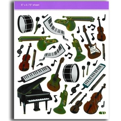 Description : Autocollants sur le thème de la musique avec des claviers, pianos, notes et instruments. Idéal pour stimuler l'enfant.'' Planche de 15,24cm x 17,14cm.'' Ne convient pas aux enfants de moins de 3 ans.