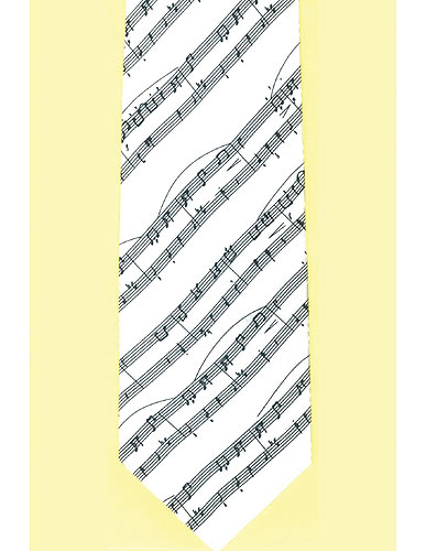 Description : Une cravate en soie de qualité avec des motifs de portée. Blanche à motifs noirs.