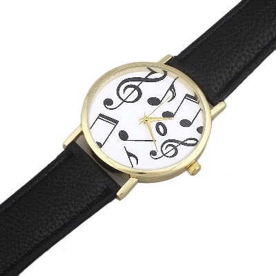 Description : Montre aux Motifs Pêle-même clé de sol et notes musicales. Cadran doré, bracelet noir.''' ''' Diamètre du cadran : 3,8 cm ''' Longueur du bracelet : 23 cm