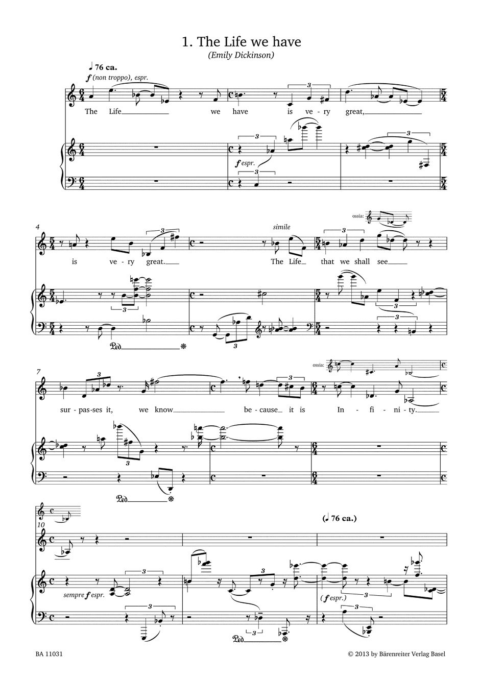 Description : The composer Rudolf Kelterborn about his work: “I call the ten compositions for female voice and piano ‘DUOS’ because the voice and instrument parts are treated musically with absolute equality and indeed often go their own independent ways. ' ' In the vocal part there are several variants, and this makes them accessible for different types of voice. ' ' The 10 duos do not form a complete cycle that can be heard only as an entire work. Smaller groups can be put together and presented according to text-related or musical aspects. ' ' The texts are by authors who have continued to inspire me for years.”