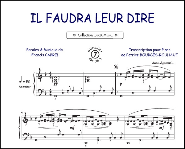Description : Cette partition est issue de la collection CrocK'MusiC constituée de transcriptions de chansons françaises pour le Piano, acompagnées de leurs paroles.