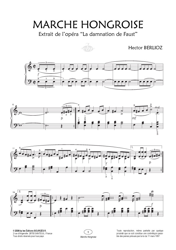 Ce morceau fut composé par Berlioz en 1846 sous le titre « Marche de Rakóczi », pour être ensuite inséré dans la première partie de la damnation de Faust, « opéra de concert » créé le 6 décembre de la même année. Empruntant la forme du lied ternaire ABA, cette puissante composition exalte le sentiment patriotique hongrois. Exécutée à Pest dans sa version orchestrale et sous la baguette du compositeur français, elle connut un immense succès et déchaîna un enthousiasme indescriptible. Pour les cinéphiles, cette musique est à jamais liée à l’acteur Louis de Funès qui la dirigea avec humour et talent dans le film culte La Grande Vadrouille de Gérard Oury.