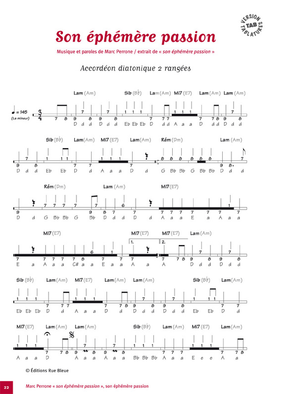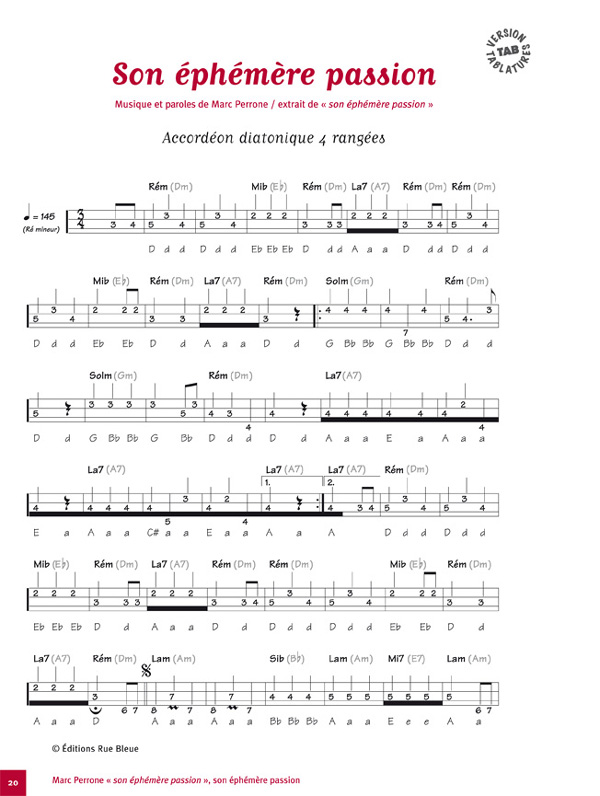 Description : Vous trouverez dans ce recueil les thèmes qui constituent mon album « son éphémère passion ». Nous avons choisi de les transcrire afin que tous les musiciens, quel que soit leur instrument, puissent s’y retrouver. Les accordéonistes diatoniques trouveront aussi des tablatures.' C’est pour moi un grand plaisir de vous présenter mes mélodies ainsi écrites, de vous permettre, si l’envie vous en vient, de les jouer. J’aime à savoir que les musiques glissent de bouches à oreilles et qu’on se les passe et repasse du bout des doigts.' La musique est un beau moyen de naviguer du dedans au-dehors, du tréfonds de l’intime à l’azur du « tous ensemble ».' Une mélodie, on peut la reprendre à l’envi, parfois se méprendre en la jouant, s’en éprendre, pourvu qu’elle circule. Bon travail à tous, prenez du plaisir.' Marc PERRONE' ' DVD « Marc Perrone en voyages »' Un documentaire de 52 minutes de Michel Coqblin' ' Marc Perrone joue « Larmes d’Espoir » sur le quai de la gare de Cassino.' Coup de sifflet, attention au départ !' La valise de Mac contient des vieilles photos de son album de famille, des souvenirs de la bataille de Cassino, un projecteur cinéma, une machine à coudre, la promesse de la banlieue, l’odeur des guinguettes, l’émigration italienne, des rires d’enfants, des mélodies, un zeste de mélancolie…
