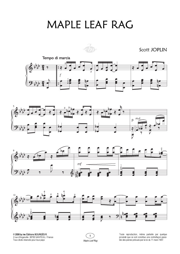 En 1899, l’éditeur John Stark publia la partition Maple leaf rag de Scott Joplin Ce dernier le baptisa d’après le Maple Leaf Club à Sédelia, boite de nuit où il travaillait. John Stark fit de Joplin l’une des grandes figures de ce nouveau courant musical. Maple leaf rag s’est vendu à plus d’un million d’exemplaires et a notamment permis à l’éditeur Stark d’acheter une presse à imprimer et de faire une nouvelle édition en couleurs avec la fameuse couverture à la feuille d’érable où apparaît la première photo connue de Scott Joplin.