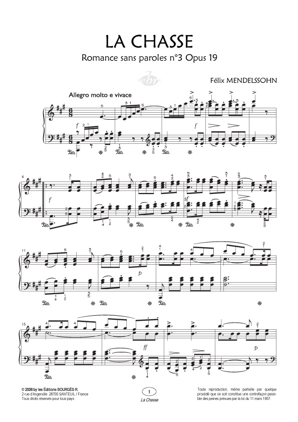 Les célèbres Romances sans paroles (Lieder ohne worte) de Felix Mendelssohn sont des pièces raffinées, mélancoliques et brèves pour piano. Ses romances, Quarante huit réparties en huit cahiers, sont créées au fil de sa vie dans les moments rares de solitude. Chacune est le reflet d’une page d’album sentimentale de son quotidien. A partir de 1832, six cahiers sont publiés en huit fascicules, par les soins du compositeur, chez l’éditeur londonien Novello. Les deux derniers paraîtront après sa mort. Quelques unes des romances ont une appellation comme Morceau pour enfants, Marche funèbre, Chant du gondolier vénitien, Chant du printemps, Chant du dévidoir, Chant populaire et Chant du chasseur. Ecrit entre 1825 et 1842, l’opus 19 est le plus connu du cahier de romances sans paroles. Il comporte six romantiques petites pièces très poétiques, chacune étant le témoignage d’un état d’âme personnel de Mendelssohn. La n°3 « Chant pour la chasse » contribue à enrichir le tableau romantique par son titre représentant la nature. Ecrite sans support littéraire, Mendelssohn laisse son œuvre s’exprimer par la pureté timbrique du piano. A travers une mélodie d’une grande expressivité, cette pièce miniature raconte une courte histoire dans l’esprit d’un petit nocturne. Par une écriture classique, dans un language empreint d’un grand lyrisme, Mendelssohn propose aux pianistes la possibilité de faire chanter leur piano.