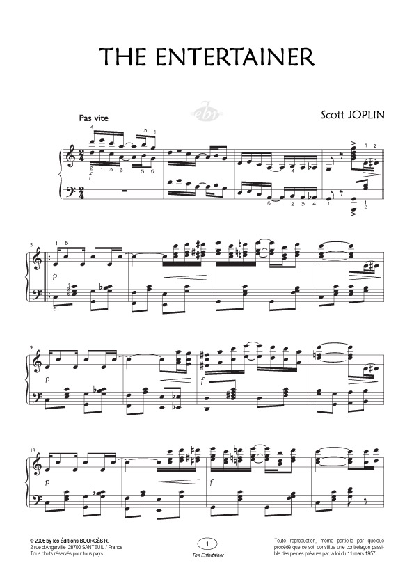 La publication par l'éditeur John Stark de sa pièce mémorable Maple Leaf Rag en 1899 marque le début de son succès et codife la structure formelle du Ragtime classique. Considérée comme l'oeuvre majeure de Scott Joplin, elle s'avère de nos jours concurrencée par The Entertainer écrit par le même compositeur en 1902 et rendu célèbre en 1974 par le film « L'Arnaque ». Dans The Entertainer, Scott Joplin essaye d'enrichir le ragtime classique par une structure rythmico-harmonique de la basse et établit des liens motiviques entre les différents airs, ce qui parfois, dans l'organisation de l'écriture semble extrêmement complexe. Même si le ragtime obéit à des règles strictes dans le tempo et le rythme, The Entertainer par son air dynamiquement enthousiasmant exalte une flamme incandescente dans l'âme de l'interprête.