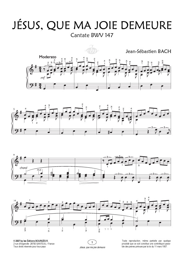 La Cantate BWV 147 comprend l’un des chorals les plus connus de toute l’œuvre de Bach : Jésus, que ma joie demeure. L’arrangement pour piano, qui vous est proposé ici, traduit fidèlement l’esprit de l’oeuvre originale. Véritable message de paix, ce choral s’appuie sur une marche mélodique au rythme ternaire et exposée en croches continues. Cette ritournelle, dans le genre de la pastorale, symbolise à elle seule toute la musique sacrée de Jean-Sébastien Bach. Témoin de la foi inébranlable du compositeur, elle reste une des mélodies les plus populaires de la musique classique et nombreux sont ceux qui la fredonnent tout naturellement, sans toujours savoir à quel thème elle est rattachée.