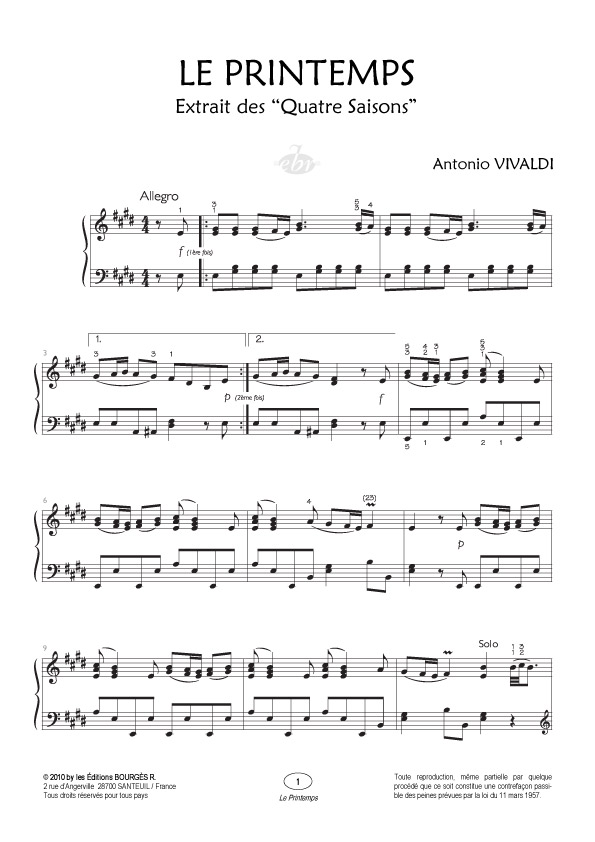 Allegro Voici le Printemps, Que les oiseaux saluent d'un chant joyeux. Et les fontaines, au souffle des zéphyrs, Jaillissent en un doux murmure.