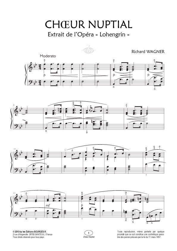 Lohengrin est le sixième opéra que Richard Wagner ait composé. Ecrit entre 1845 et 1848, créé en 1850, cette œuvre est basée sur l'histoire du « chevalier au cygne », provenant de la littérature médiévale allemande. Lohengrin connut un succès immédiat et eut une grande importance dans la carrière musicale du compositeur. En effet, pour la première fois, on sent le langage musical de Richard Wagner se libérer définitivement de la tradition classique et montrer pleinement un caractère romantique. Dans une lettre adressée à Liszt datée de 1853, Richard Wagner dit: «Je m’aperçois que dans Lohengrin, j’ai oublié une indication de mouvement, omission que je n’ai constatée que lorsque je l’ai dirigé. C’est dans le chœur nuptial en ré majeur, après le second solo des huit femmes, les huit dernières mesures avant le premier mouvement : ici, le mouvement doit être considérablement ralenti, plus qu’à la première entrée en ré majeur; cela doit se faire tranquillement, solennellement, sinon l’intention est manquée.» Le chœur nuptial dont Richard Wagner fait mention marque le début du troisième acte de l'opéra, lorsqu'Elsa et son époux pénètrent dans la chambre nuptiale où ils se déclarent leur amour : `que les bruits de la fête s'éteignent, que vos cœurs s'enivrent! Que la chambre parfumée parée pour l'amour vous accueille à présent''. Aujourd'hui, cette marche nuptiale accompagne traditionnellement les mariés à l’entrée ou la sortie de l’Eglise en Occident. Elle est traditionnellement jouée à l’orgue, mais peut être jouée par un orchestre. Elle est parfois appelée “la marche des fiançailles” (ou des fiancés).