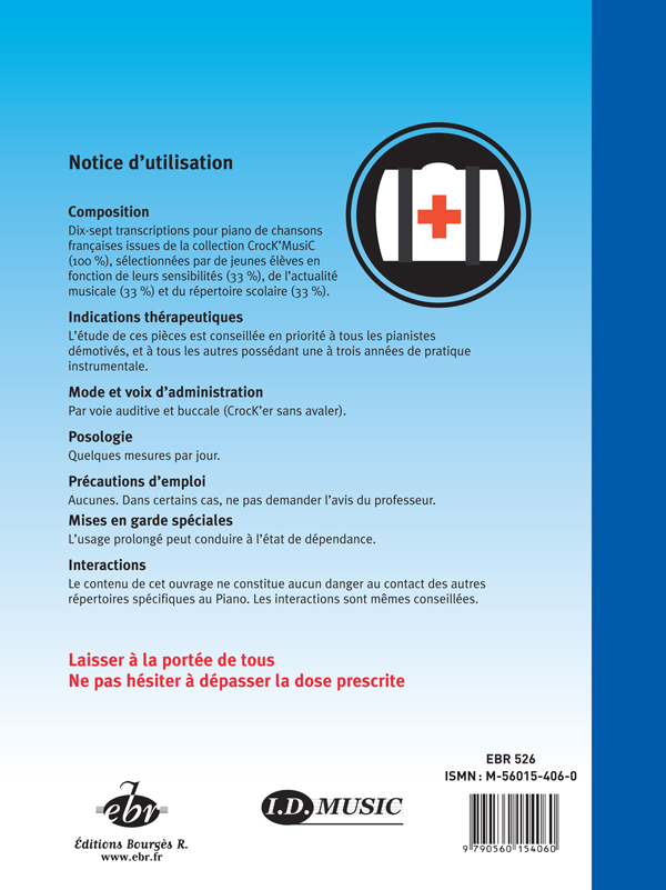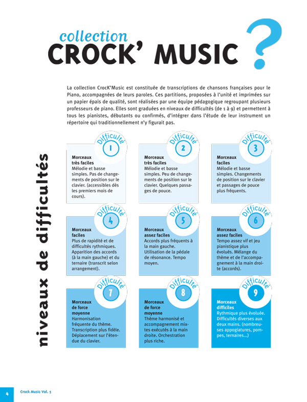 Description : Cet ouvrage est le fruit de dix ans d’enseignement pianistique. '' '' J’ai souvent vu arrivé comme d’autres professeurs de jeunes élèves démotivés, ayant perdu tout intérêt à la pratique de la Musique après seulement une ou deux années d’apprentissage. '' '' A l’écoute de leurs désirs, j’ai commencé à écrire des transcriptions d’œuvres proches d’eux, que ce soit par l’actualité musicale, scolaire ou tout simplement par leur propre sensibilité à tel ou tel artiste. '' '' Chaque arrangement devait prendre en compte leur capacité technique afin de donner à ces pianistes une sensation de facilité. Leurs lacunes en lecture s’effaçaient en sollicitant le travail de l’oreille sur ces chansons connues de tous. '' '' Quelques mois suffisaient à ces pianistes pour retrouver un sens à leurs efforts, et s’intéresser à nouveau à des répertoires aussi traditionnels qu’indispensables. '' '' Ainsi est née la collection CrocK’MusiC qui permet aujourd’hui à tous l’étude de ces transcriptions. '' '' Patrice Bourgès