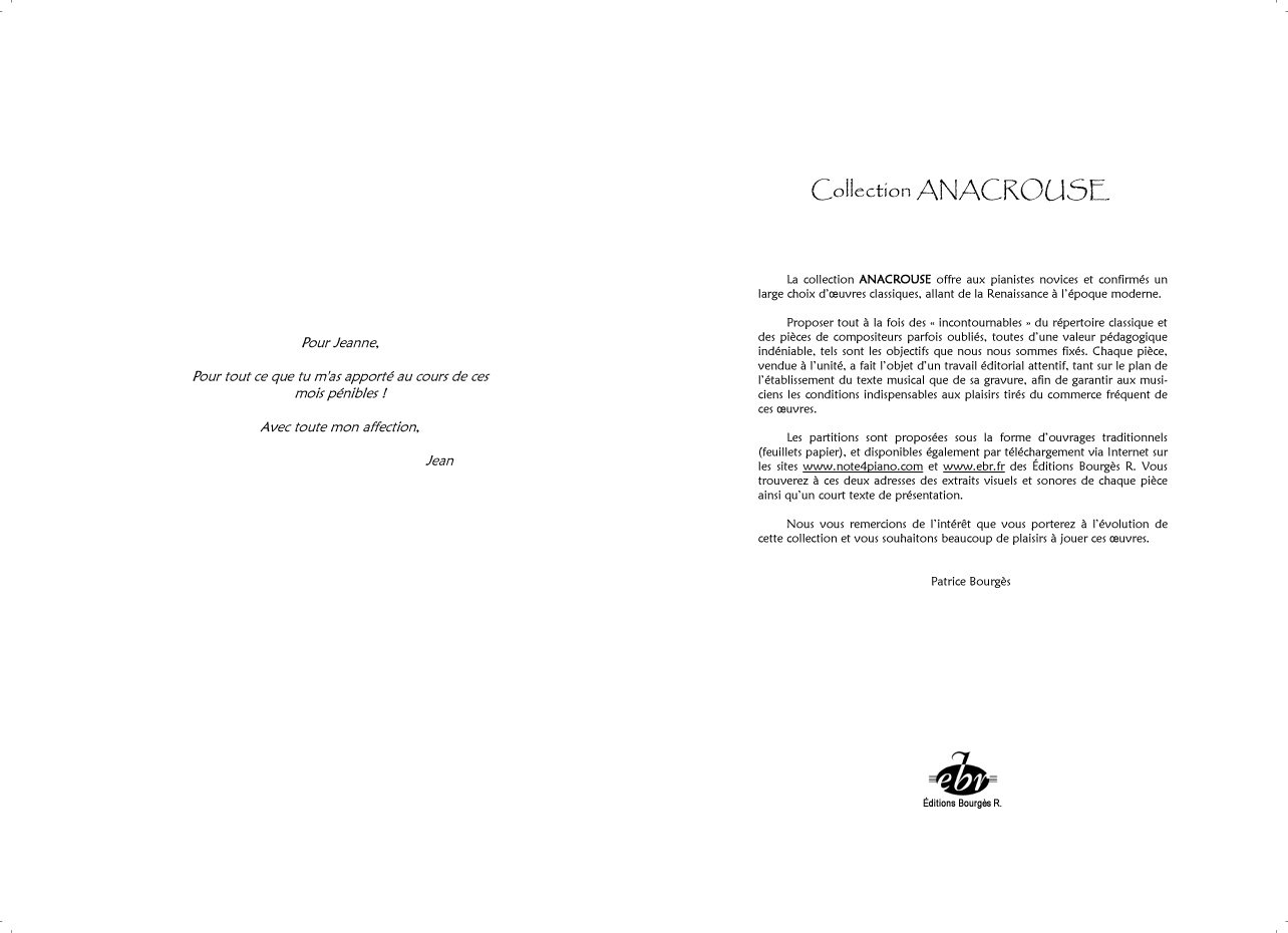 Description : Un remerciement, un hommage, un cadeau, une envie...Il est possible aujourd'hui de personnaliser chaque titre de la collection Anacrouse (Editions Bourgès R.).' ' Que ce soit une phrase, un message d'attention, un prénom, une dédicace, une maxime, expression...ou tout simplement une fantaisie, nous intégrerons vos mots à l'impression de la partition.'' '' Une exclusivité Note4Piano !'' '' Après l'achat de l'option, un espace texte vous sera proposé lors du processus de votre commande.