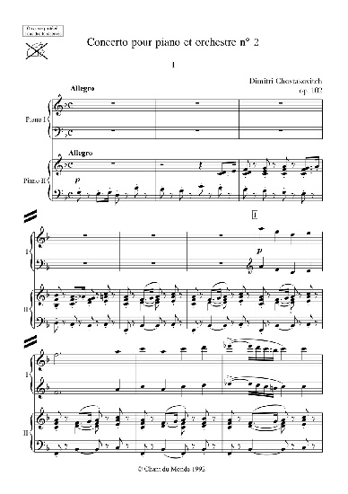 Description : Les Editions Le Chant du Monde viennent de publier une nouvelle gravure du Concerto pour piano n°2, opus 102, de Dimitri Chostakovitch, dans la version pour deux pianos, réalisée par le compositeur.' ' 76 pages sous couverture, en format A4, pour une lecture aérée et claire d'une des pièces maîtresses de la littérature pour piano du XXe siècle.' ' Ce concerto a été composé en 1957. La première mondiale a eu lieu le 10 mai de cette année dans la Grande Salle du Conservatoire de Moscou, avec Maxime Chostakovitch en soliste et l'Orchestre Symphonique de l'Etat d'URSS, sous la direction de Nikolai Anosov.'