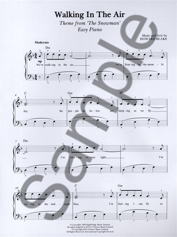 Description : Raymond Briggs' charming Christmas story about the adventures of a boy and the snowman that comes to life is a modern children's classic. The tales popularity has been further enhanced by frequent television broadcasts of the award-winning cartoon film The Snowman.' Here the popular classic Walking In The Air is arranged for easy Piano