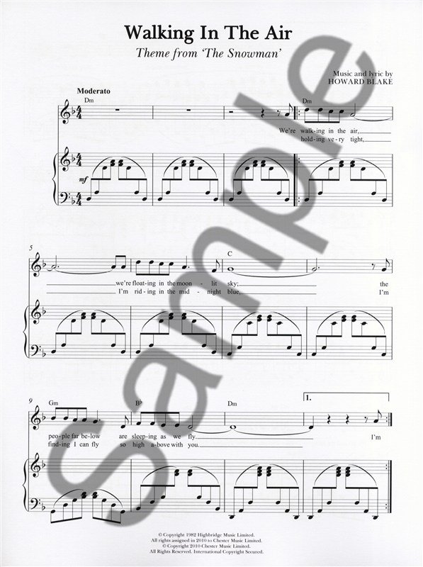 Description : Raymond Briggs' charming Christmas story about the adventures of a boy and the snowman that comes to life is a modern children's classic. The tales popularity has been further enhanced by frequent television broadcasts of the award-winning cartoon film The Snowman.' ' Here the classic 'Walking In The Air', made popular by Aled Jones is arranged for Voice and Piano. Music and lyrics by Howard Blake.