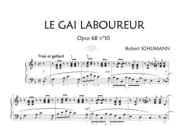 En 1848, Schumann écrit quelques piècettes pour l’anniversaire des sept ans de sa fille Marie. Puis au fur et à mesure, en quelques semaines, il se met à composer d’autres petits morceaux. Finalement il rassemble dans un groupe éclectique les petites pièces faciles puis les complète par la suite avec d’autres, de niveau tout à fait élémentaire, s’adressant aux petits doigts novices des pianistes novices. Schumann a réuni toutes ces œuvres dans un recueil appelé L’album pour la jeunesse, le Weihnachtsalbum en allemand. Il se compose en tout de quarante-trois piècettes qui ont été publiées sous l’opus 68 en 1848. La première parution est éditée avec une couverture faite par l’illustrateur connu de contes de fées, Ludwig Richter. Ce recueil devient populaire très rapidement près du jeune public, car il contient un macrocosme enfantin universel à tous les peuples. Son succès a permis d’éveiller des milliers d’enfants à la musique à travers le monde. Chaque morceau porte un titre attirant mais dissimule un petit problème technique. Schumann aborde cet exercice avec un regard pur et avec une certaine fraîcheur très adaptée à ces jeunes destinataires. L’album est réparti en deux divisions. La première moitié s’adressant aux petits se compose des dix- neuf premières pièces. La deuxième moitié « pour les plus grand », comportent des pièces un peu plus longues et façonnées. Schumann cherche la simplicité dans ses œuvres par l’utilisation des tonalités les plus fréquentes, jusqu’à proposer quatre dièses au maximum, avec le mi majeur et par la brièveté des pièces, les plus courtes sont en quatre lignes et les plus longues sont en trois pages. Nous avons sélectionné trois piècettes adressées aux petits. Elles sont de style différents et présentent des difficultés techniques variées et accessibles. Le n°2 Marche militaire est d’une nature joyeuse, sur un tempo dynamique agrémenté de staccato. Elle emprunte, sur un autre rythme, la courbe mélodique du Scherzo de la sonate pour violon et piano opus 24 surnommé la sonate du printemps de Beethoven. Le n°5 intitulé Le petit morceau s’apparente à la pièce N°1, Mélodie, dans le traitement mélodique et harmonique. Cette piècette présente une mélodie accompagnée sur une tonalité de do majeur. Le n°10 intitulé le gai laboureur est le morceau le plus connu du recueil. Il acquit une très grande popularité après sa publication. Sa mélodie en fa majeur chantée à la main gauche, dans les graves du piano, est d’une fraîcheur inouïe qui se passe de tout commentaire. Cet album pour la jeunesse de Schumann n’est pas réservé uniquement aux petits, mais peut susciter dans l’esprit des plus grands des sentiments de jeunesse et des plaisirs enfantins.