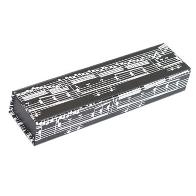 Description : Boîte rectangulaire en carton contrecollé papier plastifié brillant.Intérieur en plastique noir semi-rigide. Fermeture par aimant. Décor partition. Pouvant servir de trousse ou de boîte de rangement sur le bureau.