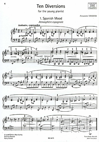Description : Les Dix Récréations ont été écrites en 1946, à la fin des années Hollywood de Tansman. Ces pièces de caractères divers, composées expressément pour les jeunes pianistes, sont aussi agréables à l’oreille qu’elles le sont pour les doigts. L’attrait de ce cycle est aussi perceptible dans les titres évocateurs : Atmosphère espagnol, Rêves, Carrousel, Tristesse, Jour de pluie, À toute vitesse, Calme, Prière, Espièglerie, Toccata / Ten Diversions was written in 1946, at the very end of Tansman’s Hollywood years. These ten diverse and delightful pieces, specifically designed for young pianists, are as fun to listen to as they are to play. The expansive nature of this cycle can be witnessed in the evocative titles: Spanish Mood, Dreams, Merry-Go-Round, Melancholy, Rainy Day, Speeding Along, Prayer, Calm, Mischief, and Toccata