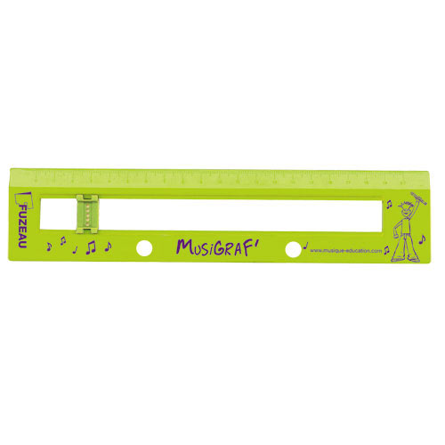 Description : Musigraf' est l'accessoire idéal pour le musicien désirant tracer une portée facilement.'' '' Son système de curseur permet de tirer les 5 traits à la longueur voulue et de respecter leur parallélisme.'' '' Le musigraf' peut se ranger dans un classeur grâce aux deux oeillets.