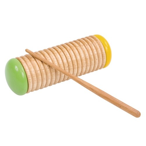 Description : Les instruments 'petites mains' :' Adaptées aux petits, cette nouvelle ligne d'instruments a été rigoureusement sélectionnée pour rendre la musique accessible dès le plus jeune âge. ' ' De matière noble et de sonorités diverses, ces ' mini percussions ' seront adoptées à coup sûr par tous les musiciens en herbe. A l'école, en famille, à la crèche, en atelier d'éveil... ces petits instruments feront également l'objet d'une véritable approche pédagogique grâce aux formes, couleurs et gestes variés... A mettre entre toutes les petites mains !' ' ' Guiro shaker en bois : Double utilisation !' ' En guiro : passez la baguette sur les cannelures, vous obtiendrez un son continu d'intensité variable selon son utilisation.' ' En shaker : secouez l'instrument pour obtenir un son rythmé grâce aux billes intérieures.' ' L. 13 cm - ø 4,5 cm' Livré avec une batte.