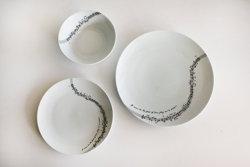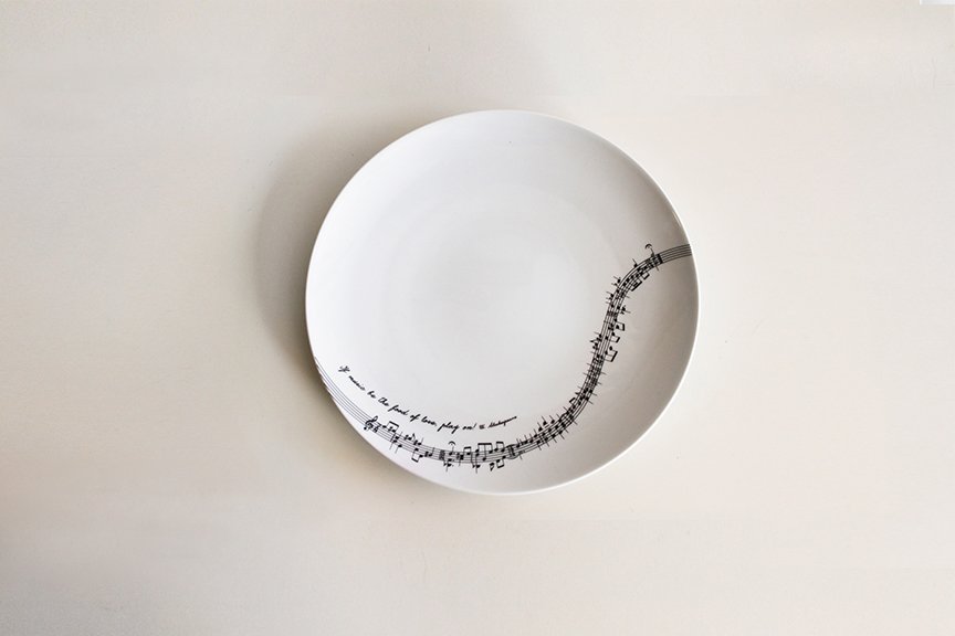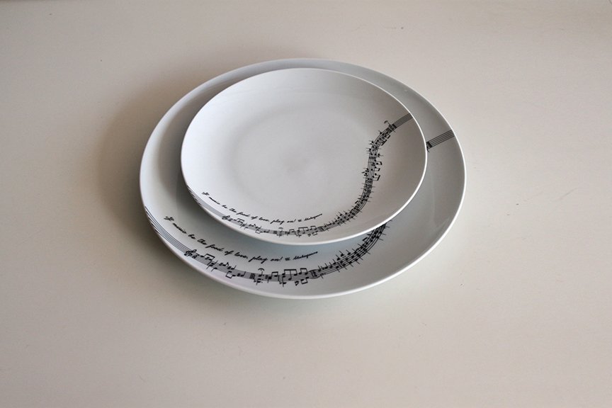 Description : New ceramic collection – Tafelmusik – with a set of three pieces distinguished by modern and minimal lines, in a high quality porcelain.' ' The original musical text is inspired by the famous words of W. Shaskespeare (“If music be the food of love, play on!”)' ' Design: MUSIC GIFT' Composer: Jonas Pinho' Portuguese guitar: Eduardo Baltar' Made in Portugal by SPAL Porcelanas.' ' Since 1965, SPAL is one of the most importants manufactures procelain dinnerware for both domestic and professional purposes.' In fine porcelaine.