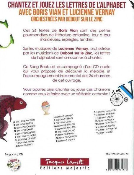 Descriptif : Notice' Alors que l'adaptation cinématographique de son chef d'oeuvre L'Ecume des jours sort en salles le 24 avril 2013, découvrez l'Abécédaire pour les enfants écrit par Boris Vian. L'Abécédaire en 26 chansonnettes de Boris Vian et Lucienne Vernay joué par Debout sur le Zinc en vente à partir du mois d'avril 2013, ce song book joliment illustré comprend : ' - les partitions des chansons (piano, voix, guitare), ' - les 26 petits textes de Boris Vian, ' - le CD orchestré par le groupe Debout sur le Zinc pour chanter sur les musiques. ' Ces 26 chansonnettes sont autant d'histoires drôles ou tendres à l'adresse des plus petits.' ' Presse' Abécédaire en 26 chansonnettes de Boris Vian et Lucienne Vernay / Debout sur le zinc (Jacques Canetti, Editions Majestic).' Dans les années 1960, Lucienne Vernay a enregistré avec Les Quatre Barbus plusieurs versions de l'abécédaire fantaisiste écrit par Boris Vian. Les musiciens gentiment déjantés de Debout sur le zinc ont eu la bonne idée de reprendre le flambeau de la compositrice et interprète. Le songbook permet de retrouver toutes les paroles, mais aussi les accords pour guitare et la partition pour piano. ' ' Air for Kids, Edition Ile de France, juin 2013' ' ' Abécédaire en 26 chansonnettes de Boris Vian et Lucienne Vernay ' Dans cet Abécédaire de Boris Vian et Lucienne Vernay, on trouve les partitions des chansons (piano, voix et guitare), les 26 courts textes drôles et tendres de Boris Vian, joliment illustrés, déclinant des prénoms de A a Z, et un CD d'orchestration interpreté par Debout sur le Zinc. Pour découvrir, en jouant sur son instrument et en chantant, la part enfantine de Vian, écrivain, poète et musicien qui écrivit l'Abécédaire pour les enfants et pour les usagers du téléphone en 1957. C'est Lucienne Vemay qui mit ces textes en musique, et enregistre l'Abécédaire en 1972 avec Les Quatre Barbus. Un univers facétieux ! ' Dès 7 ans '