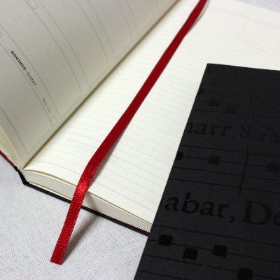 Perpetual diary with a printed hymn to St. Cecilia in black against a black background.''