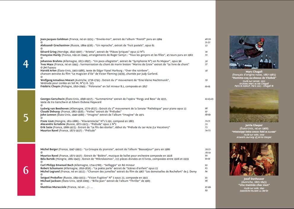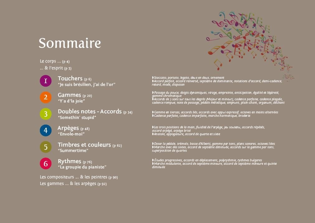 Descriptif : Ce deuxième volume se compose de six leçons qui suivent la chronologie des époques musicales. Il permet d'acquérir technique, sens de l'harmonie, de la polyphonie et de l'accompagnement, sensibilité aux différents styles et répertoires.' ' Chaque leçon contient beaucoup d'informations. Un bon rythme peut être de travailler deux leçons par an, en choisissant des oeuvres complémentaires en lien avec les sujets abordés.' ' Vous pouvez visualiser 4 pages du chapitre 4 consacré aux arpèges.