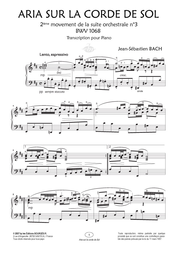La partition ici présentée est une transcription pianistique du deuxième mouvement de la suite n°3 de Jean-Sébastien Bach, une des pages les plus justement célèbres du compositeur allemand. Écrite à l’origine pour un effectif instrumental constitué de cordes seules et d’un continuo joué au clavecin, cet Aria doit sans doute sa popularité à son caractère grandiose, sa puissance expressive et la beauté immuable de son discours musical. La ligne mélodique, très flexible, est soutenue par le rythme régulier de la basse qui alterne les sauts d’octaves ascendants et descendants. Les enchevêtrements contrapuntiques, situés vers le milieu de la deuxième partie de l’Aria, constituent le sommet expressif de la pièce qui se termine comme elle a commencé, dans un climat d’une grande sérénité.