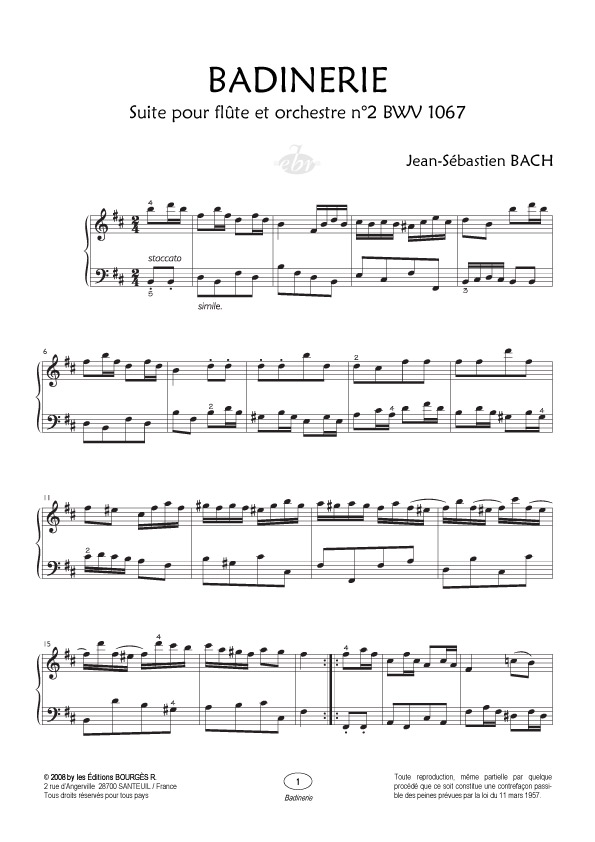 À l’Ouverture succèdent un Rondeau, une Sarabande, deux Bourrées, une Polonaise, un Menuet et enfin, la célèbre Badinerie, ici transcrite pour piano, qui par son rythme fougueux et communicatif, donne à tout mélomane l’envie irrésistible de danser et faire la fête.