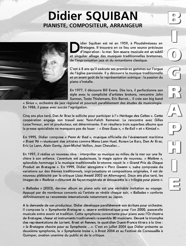 Descriptif : Le recueil de partitions de l'album du même nom, revues et corrigées par Didier Squiban lui-même !