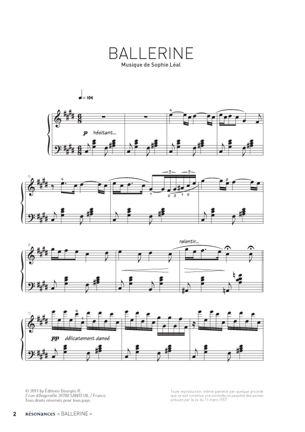Descriptif : La composition est quelque chose d'exigeant, de mystérieux. Je ne peux rien écrire pendant une longue période et puis je ne sais pour quelles raisons, l'inspiration m'appelle, le geste musical se présente sous mes doigts, dans ma tête et là c'est le bonheur. Je pense souvent à cette réflexion de Rainer Maria Rilke sur le nécessité de créer. Elle me guide chaque jour. Sophie Léal