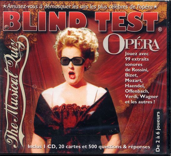 Descriptif : Vous êtes du genre à dire en écoutant la Chevauchée des Walkyries: `Tiens, je connais… C'est la scène des hélicos dans Apocalypse Now !`'' '' BLIND TEST OPERA est fait pour vous !'' Essayez-le ! Vous n'écouterez plus jamais l'Opéra comme avant…'' '' `Le quizz musical se complique parfois : certains morceaux sont joués à l'envers`. Aurélie Kieffer - France Info.'' '' Voici rassemblés les extraits des plus beaux airs d'opéra jamais écrits ! Mettez le CD dans votre chaîne hi-fi, retournez une carte et répondez à des questions sur les extraits que vous entendez !'' '' Ecoutez et jouez !'' '' Qui à écrit la Bohême ?'' Quel est le titre de cet extrait célébrissime entendu dans une publicité pour le riz Taureau ailé ?'' Quand Mozart a-t-il écrit l'Enlèvement au Sérail ?'' '' Attention, quelques REVERSO (morceaux diffusés à l'envers), MODULO (morceaux déformés) et même un PLACEBO (clin d'oeil !) se sont glissés dans ce jeu très sérieux !