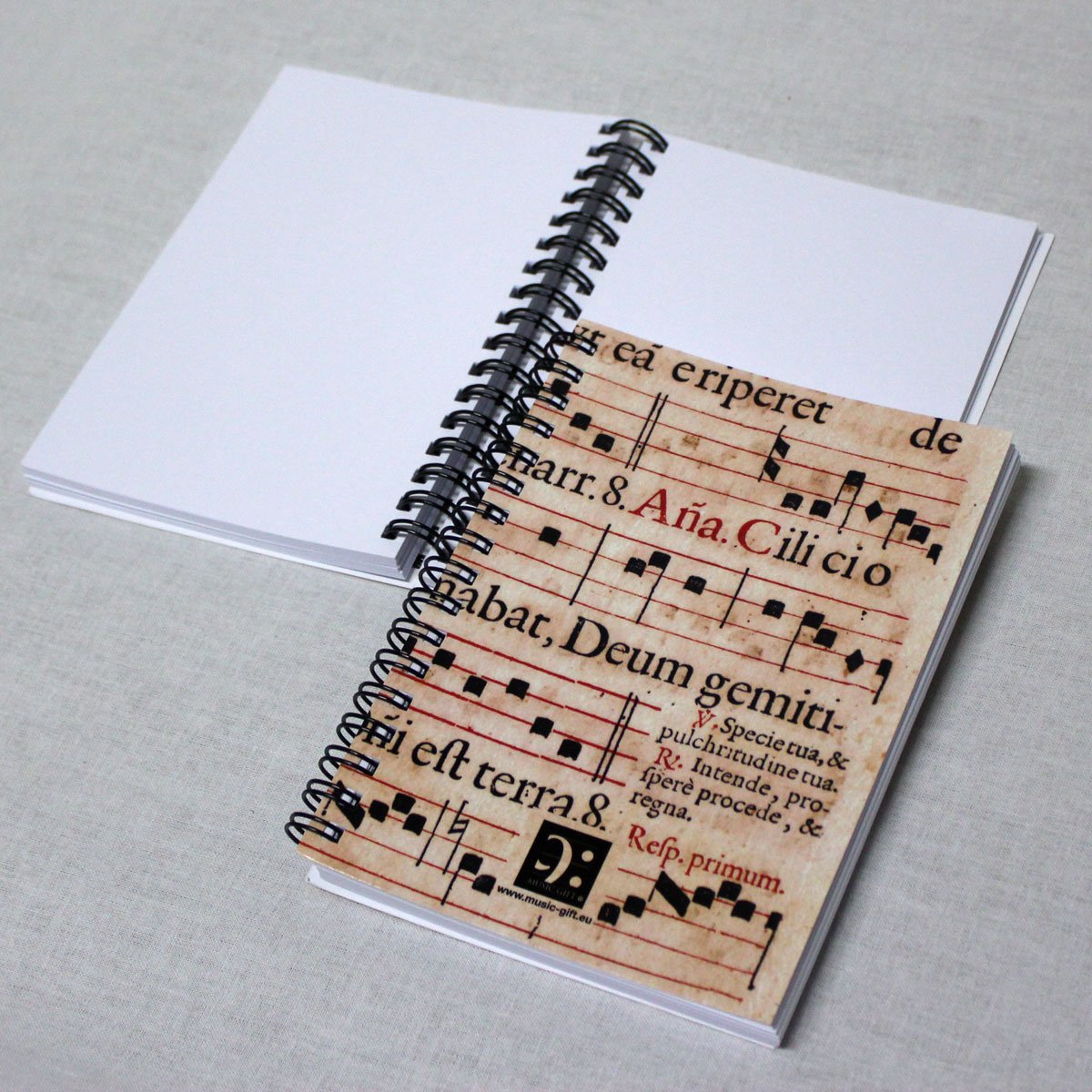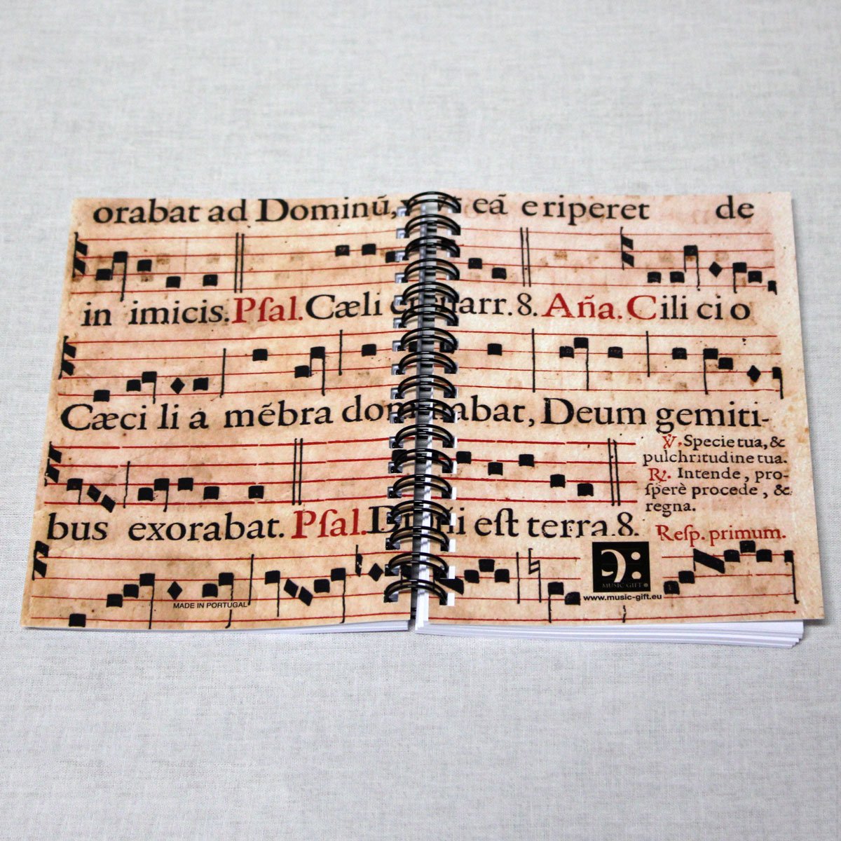Descriptif : Bloc-notes avec comme illustration de la couverture l'hymne de la Sainte Cécile, patronne des musiciens. ' ' Notebook printed with a hymn to Saint Cecilia, the patron saint of musicians and church music.' ' ' A6- 10,5 cm x 14,8 cm 100 sheets INSIDE: blank page