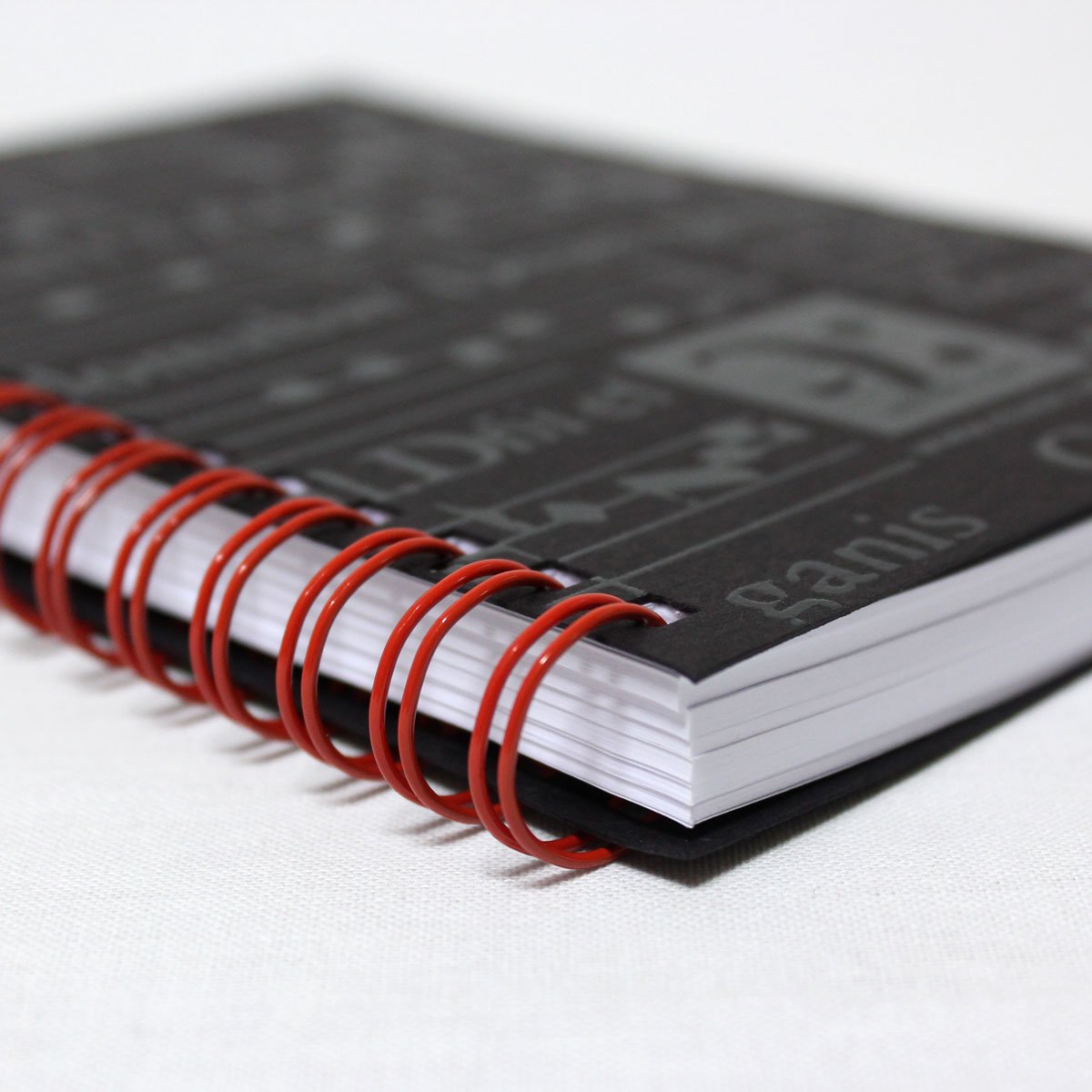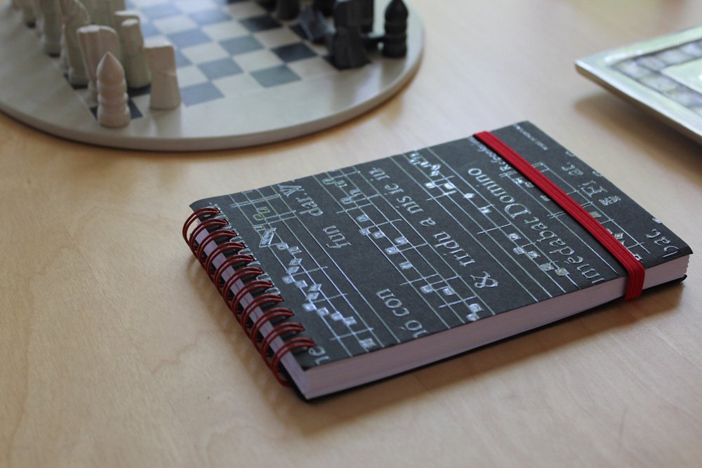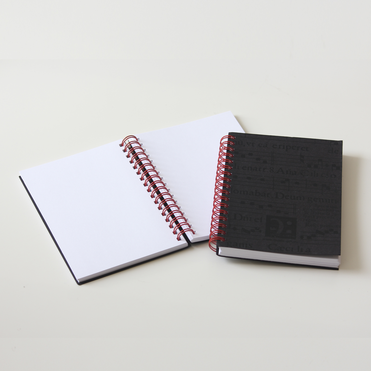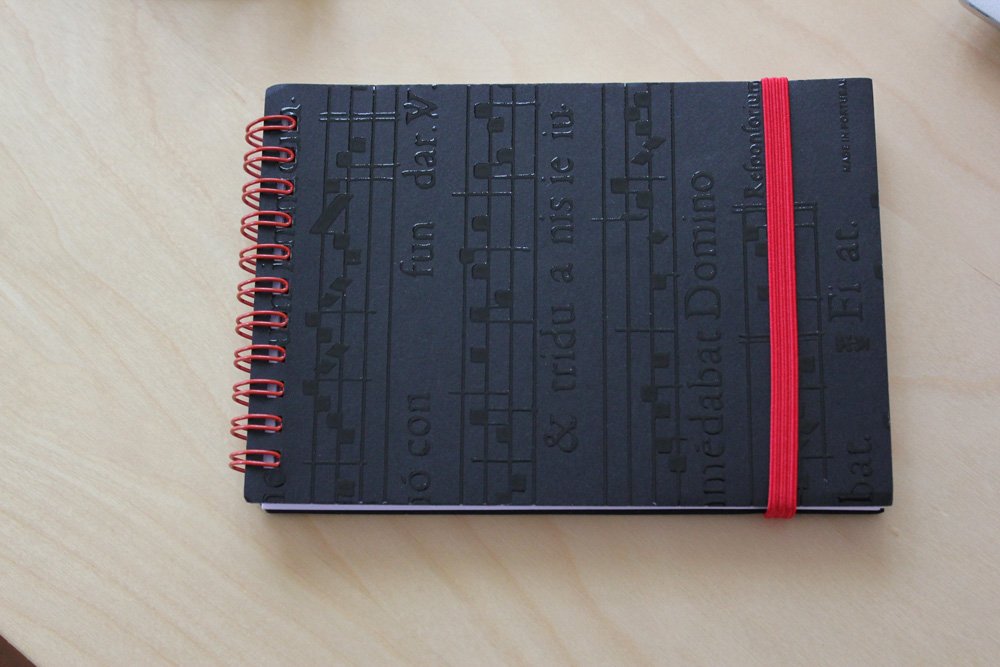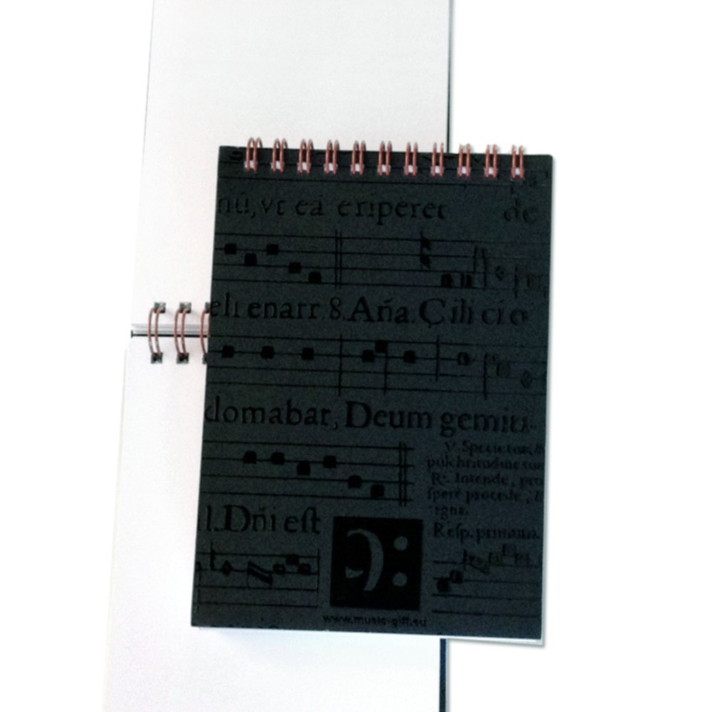 Descriptif : Bloc-notes avec comme illustration de la couverture l'hymne de la Sainte Cécile, patronne des musiciens. ' ' Notebook printed with a hymn to Saint Cecilia, the patron saint of musicians and church music, in black against a black background.' ' A6- 10,5 x 14,8 cm 100 sheets INSIDE: blank pages