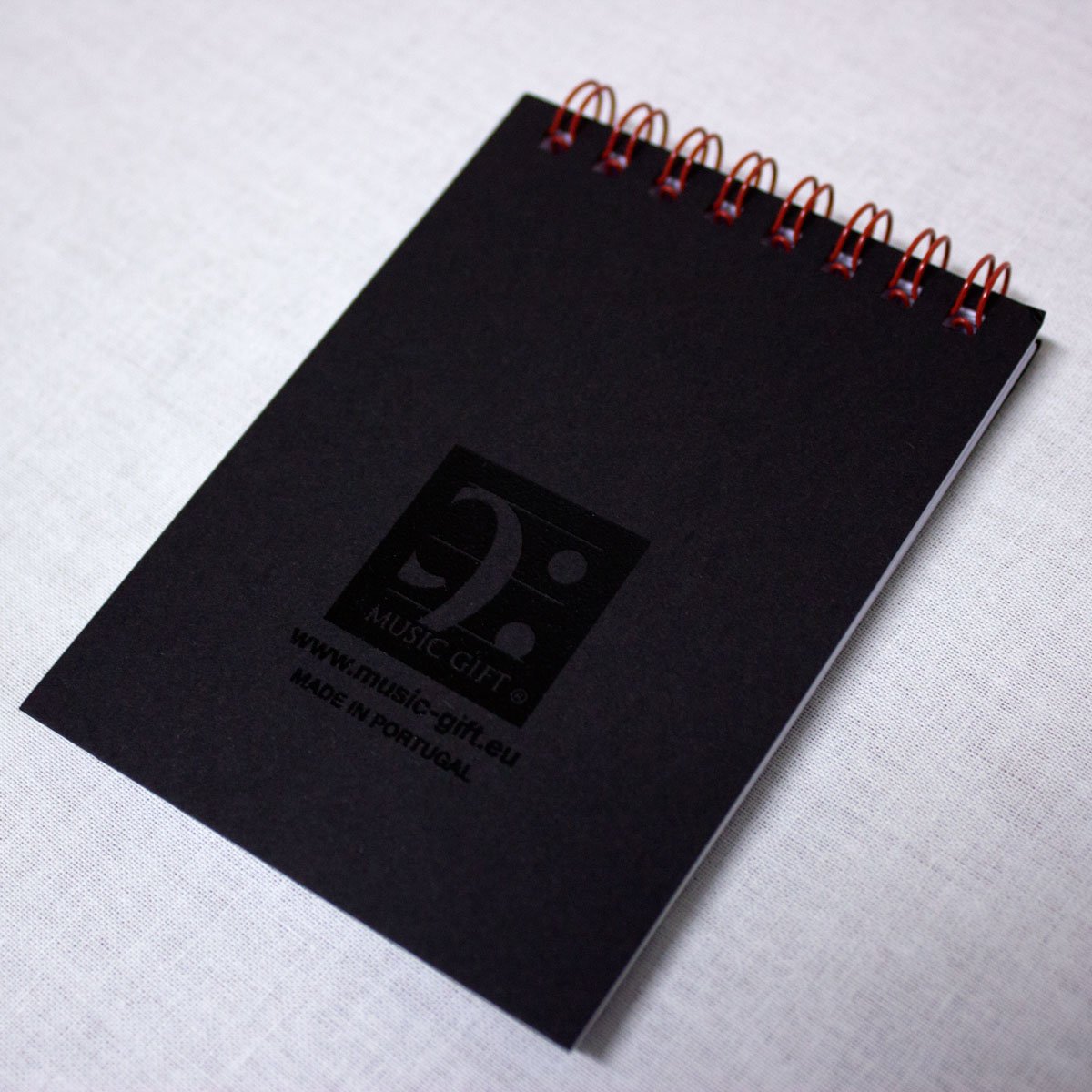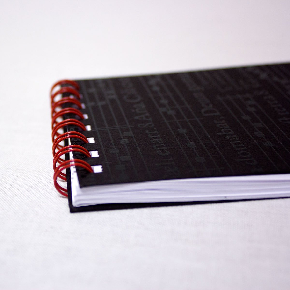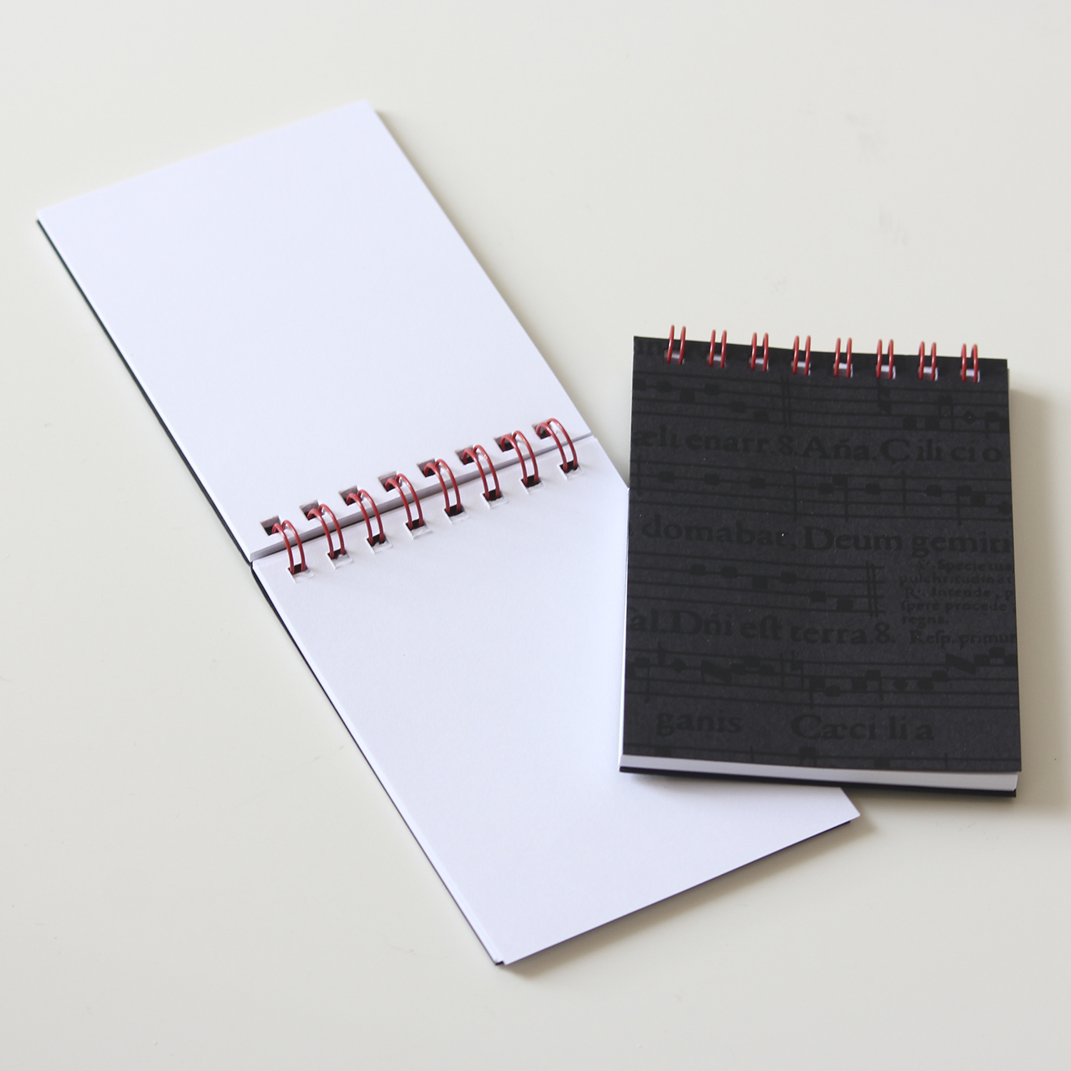 Descriptif : Bloc-notes avec comme illustration de la couverture l'hymne de la Sainte Cécile, patronne des musiciens.' ' Notebook printed with a hymn to Saint Cecilia, the patron saint of musicians and church music, in black against a black background.' ' ' A7- 7,4 cm x 10,5 cm 48 sheets INSIDE: blank pages