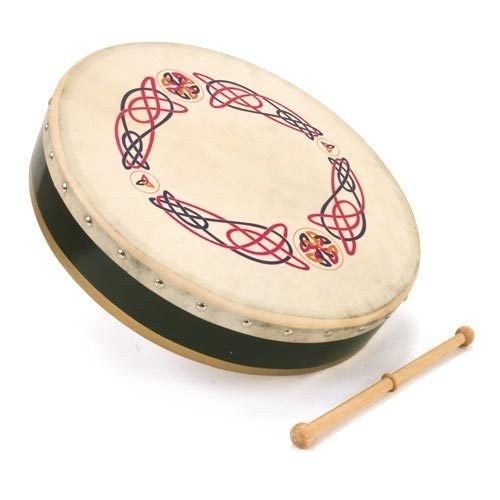 Descriptif : Instrument de musique traditionnelle irlandaise. ' ' Dans les Pubs, dans la rue, ou en concert, cet instrument irlandais fait danser et chanter tout les amateurs de grande musique au son des percussions et rythmiques typiquement irlandais.' ' Frapper sa peau naturelle avec le bâton tenu par le milieu pour que les deux extrémités rebondissent sur la peau. ' ' La main qui tient l'instrument permet de jouer avec la tension de la peau pour faire varier le son.' ' Livré avec un bâton (stick ou tipper).
