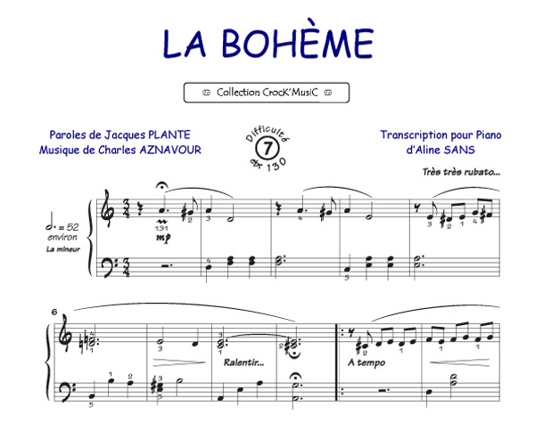 Descriptif : Cette partition est issue de la collection CrocK'MusiC constituée de transcriptions de chansons françaises pour le Piano, acompagnées de leurs paroles.