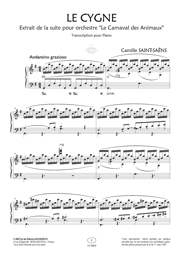 Le Cygne de Saint-Saëns est un célèbre duo pour piano et violoncelle. Il fait partie d'une suite musicale pour orchestre et piano intitulée Carnaval des Animaux, grande fantaisie zoologique. Cette oeuvre est composée de quatorze mouvements écrits lors d'un voyage en Autriche en février 1886. Saint-Saëns, de son vivant, ne souhaite pas que l'oeuvre soit portée à la connaissance du public, à l'exception du Cygne. Cette pièce est illustrée par la ballerine Anna Pavlowa. Son interprétation du cygne popularise la pièce sous le nom de « la mort du cygne ». Saint-Saëns dépeint dans le Carnaval des animaux des portraits d'animaux, l'éléphant, le coucou, les kangourous et les pianistes eux-mêmes font parties de ce défilé zoologique. Ce sont des parodies musicales où l'auteur raille les compositeurs et les interprètes. Il les décrit avec un humour mordant, parfois justifié.