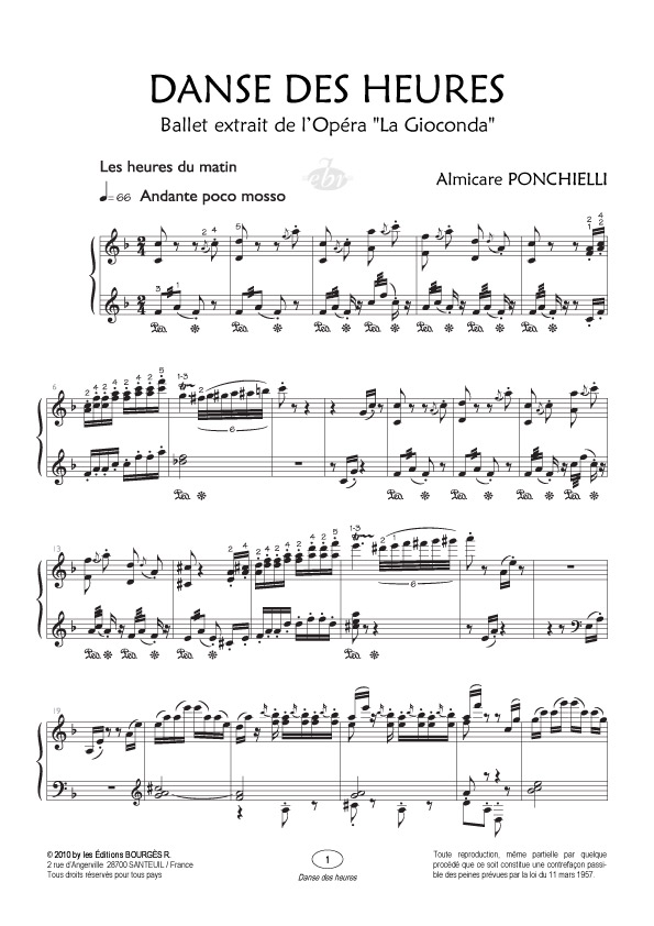 Descriptif : La collection ANACROUSE offre aux pianistes novices et confirmés un large choix d’œuvres classiques, allant de la Renaissance à l’époque moderne.' ' Proposer tout à la fois des « incontournables » du répertoire classique et des pièces de compositeurs parfois oubliés, toutes d’une valeur pédagogique indéniable, tels sont les objectifs que nous nous sommes fixés. Chaque pièce, vendue à l’unité, a fait l’objet d’un travail éditorial attentif, tant sur le plan de l’établissement du texte musical que de sa gravure, afin de garantir aux musiciens les conditions indispensables aux plaisirs tirés du commerce fréquent de ces œuvres.' ' Les partitions sont proposées sous la forme d’ouvrages traditionnels (feuillets papier), et disponibles également par téléchargement.' ' ' ' Tombé dans l’oubli depuis des siècles, l’opéra La Gioconda est sans doute le chef d’œuvre de Ponchielli.' La partie du ballet « La danse des heures » reste néanmoins familière aux oreilles des profanes puisque cette pièce a été insérée dans Fantasia, le célèbre dessin animé de Walt Disney.' Morceau très contrasté, à la fois gracieux et mouvementé, cette page demeure inspirée et mérite à coup sûr d’être redécouverte, en dehors de l’utilisation abusive que la publicité et le cinéma en ont faite.