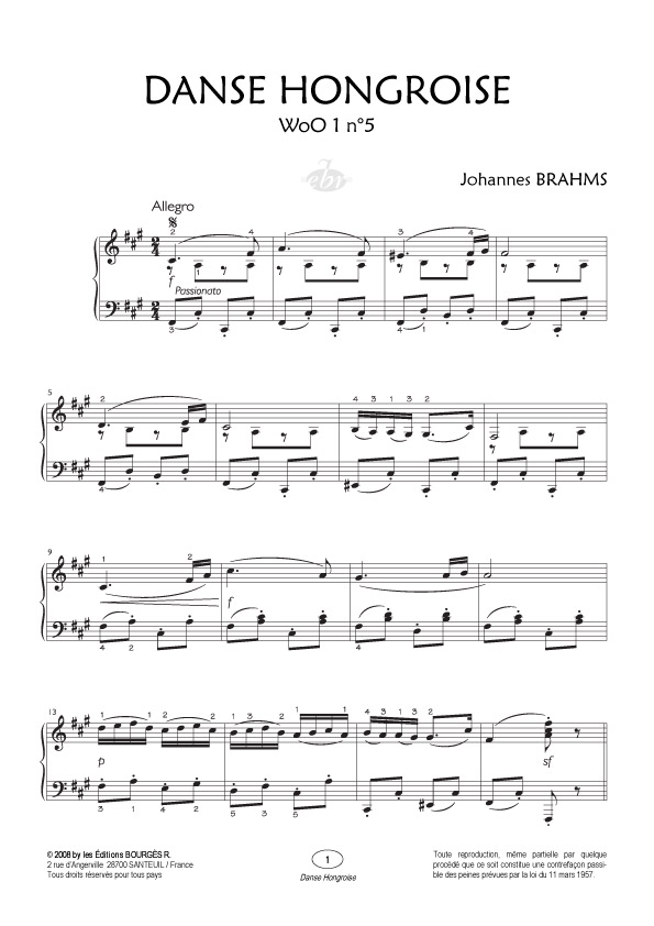 Les 21 danses hongroises de Johannes Brahms ont été publiées par Simrock sous le titre Danses hongroises, arrangées pour le piano par Johannes Brahms. Il ne considère pas ces oeuvres comme une création originale mais comme une simple adaptation de musique traditionnelle, donc il n'a pas mis de numéro d'opus. En 1869, les deux premiers cahiers sont publiés et en 1880, les deux autres. Ces danses sont écrites d'abord à quatre mains. Il créé une version à deux mains des deux premiers cahiers, puis une version pour orchestre du n°3 au n°10. La cinquième danse hongroise en fa # mineur est une des danses les plus célèbres. Cette pièce est empruntée au Souvenir de Bartfai de Kéler Bela. Brahms introduit des éléments du Verbunkos hongrois et principalement les csardas. Elle se caractérise ici par des changements de tempi lents à rapides. Le fait de ralentir ou d'accélérer est typique dans le folklore musical hongrois. Aucune monotonie ne s'en découle. Ces airs sont transfigurés par Brahms où les couleurs folkloriques vacillent frénétiquement à travers ces divers changements musicaux.