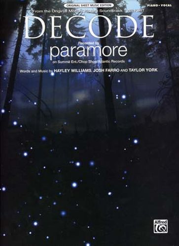 Descriptif : Partitions pour chant, piano de la chanson `Decode` par le groupe Paramore, issue du film à succès `Twilight`. Version format.