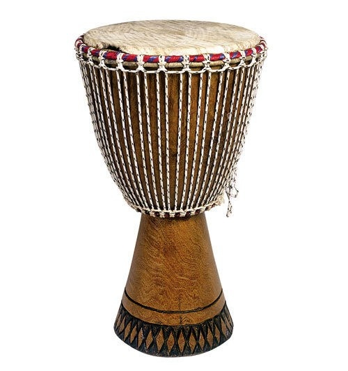 Descriptif : Fabriqué dans la région des pays Mandingues, ces djembés sont taillés dans des bois rouges (teck). ' ' Aucun entretien n'est nécessaire.' ' ø 32 cm - H. 62 cm. ' ' Les dimensions peuvent varier selon les djembés.