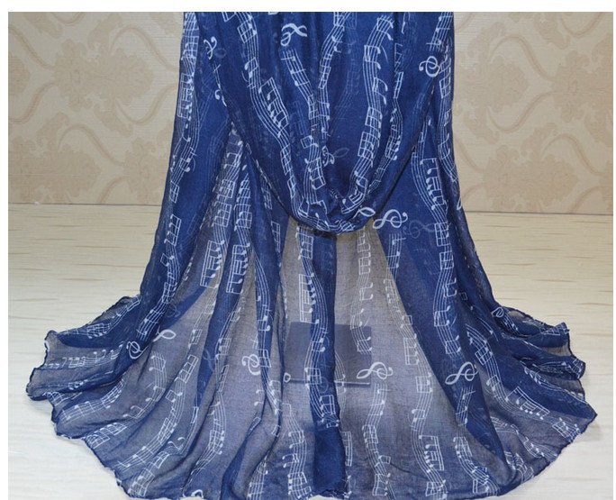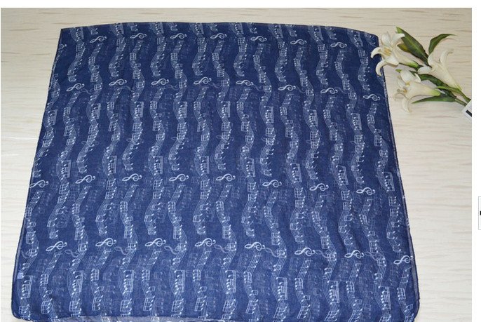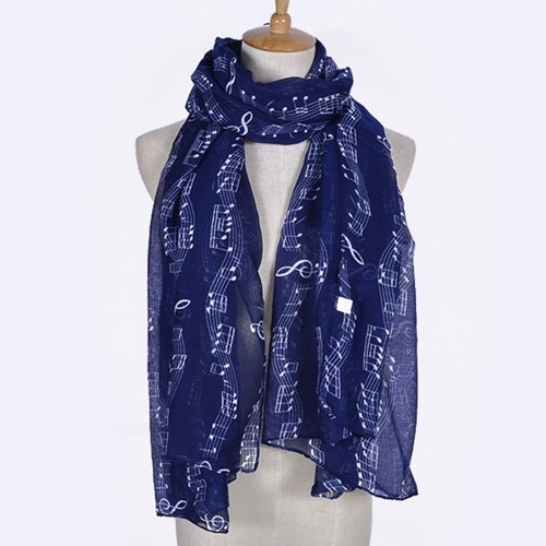 Descriptif : Superbe foulard de couleur bleu foncé. Le matériau utilisé conviendra aux peaux les plus sensibles.' ' La taille du foulard est grande et permettra diverses utilisations.' ' Cadeau original pour musicien(ne) ou tout autre amateur de musique.' ' An awsome scarf with music notes and G Key.' ' Amazing Scarf with amazing dark blue Color. Soft Material of the scraft will be good even for very sensitive skin.' ' The size of this musicain scarf is pretty big that you can make many different compositions.' ' This scarf will be an unreplacable detail of your wardrobe. ' ' It can be also an original gift for musicians and everyone who likes music.' ' 100 % viscose' Dimensions : 190 cm X 90 cm