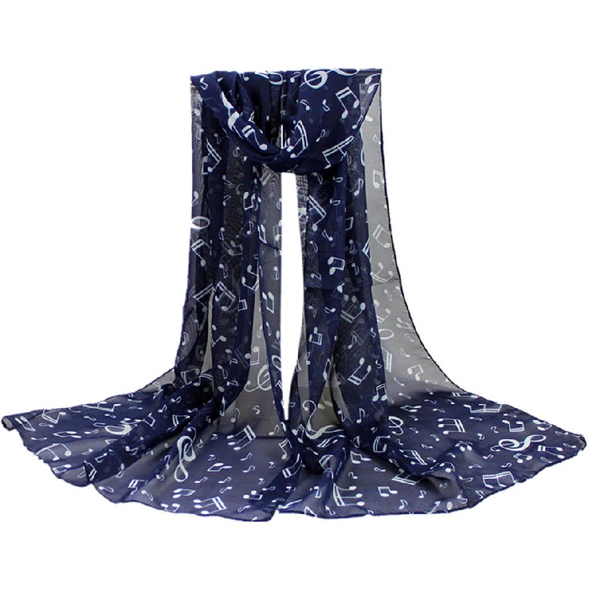 Descriptif : ' Foulard très léger avec une impression originale de notes de musique et clé de sol.' ' Cadeau original pour musicien(ne) ou tout autre amateur de musique. ' ' Very thin chiffon Scarf with original print of Music notes and G Key.' ' It can be an original Gift.' ' 100 % Polyester' Dimensions : 153 cm X 50 cm