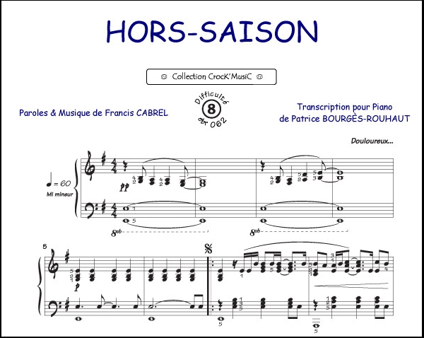 Descriptif : Cette partition est issue de la collection CrocK'MusiC constituée de transcriptions de chansons françaises pour le Piano, acompagnées de leurs paroles.