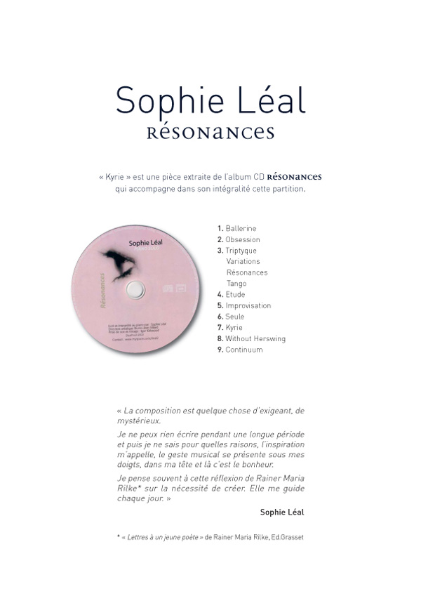 Descriptif : La composition est quelque chose d'exigeant, de mystérieux. Je ne peux rien écrire pendant une longue période et puis je ne sais pour quelles raisons, l'inspiration m'appelle, le geste musical se présente sous mes doigts, dans ma tête et là c'est le bonheur. Je pense souvent à cette réflexion de Rainer Maria Rilke sur le nécessité de créer. Elle me guide chaque jour. Sophie Léal