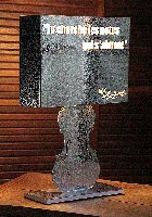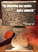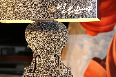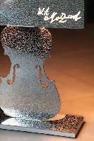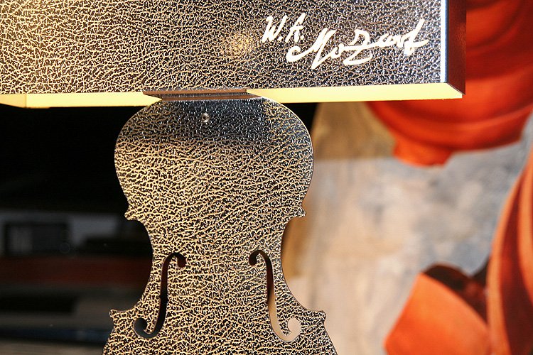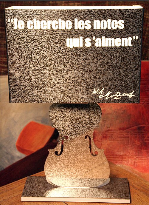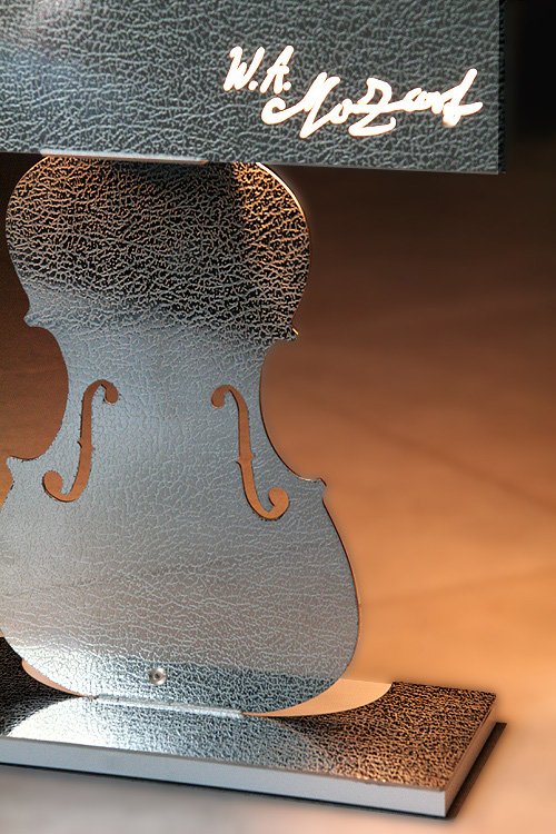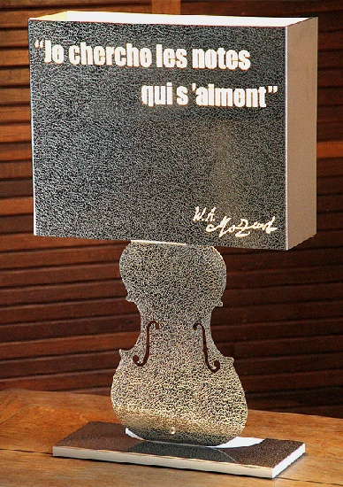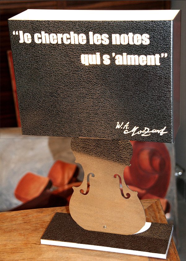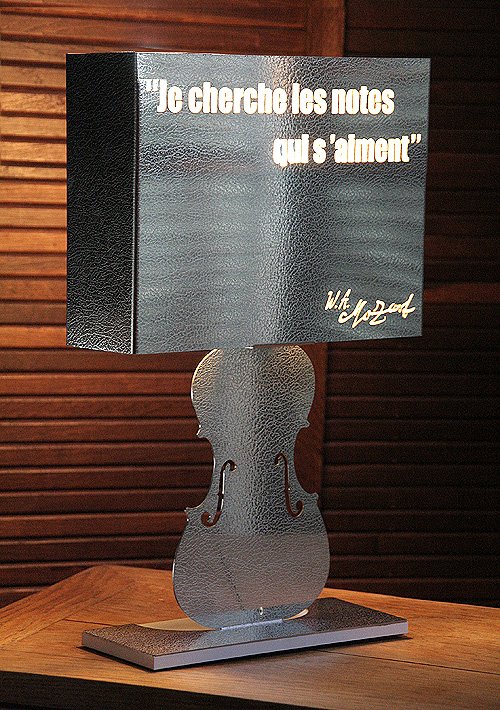 Descriptif : Amadeus est une lampe de bureau qui peut prendre place sur une table de salon, la bibliothèque d'un mélomane, tout comme sur un chevet ou un piano...''' ''' Elle est conçue et réalisée en une seule pièce (une plaque d'inox effet cuir) formée, découpée au laser et pliée. D'un design résolument contemporain, elle est toute dédiée à la musique avec une magnifique citation de Mozart ainsi que la signature du compositeur, qui apparaîtront par transparence quand la lampe sera allumée. ''' ''' La partie arrière de l'abat-jour est réalisée dans une résine diffusante qui permet à sa lumière de se propager librement.''' ''' Dimensions 44 cm de hauteur, 28 cm de largeur sur 10 cm de profondeur pour un poids d'environ 2,3 kg. ''' ''' Son socle justement dimensionné lui confère une excellente stabilité et des patins en caoutchouc protégeront le verni de votre piano ou le revêtement de votre meuble quel qu'il soit. ''' ''' Amadeus est équipée d'une ampoule basse consommation de 15w.