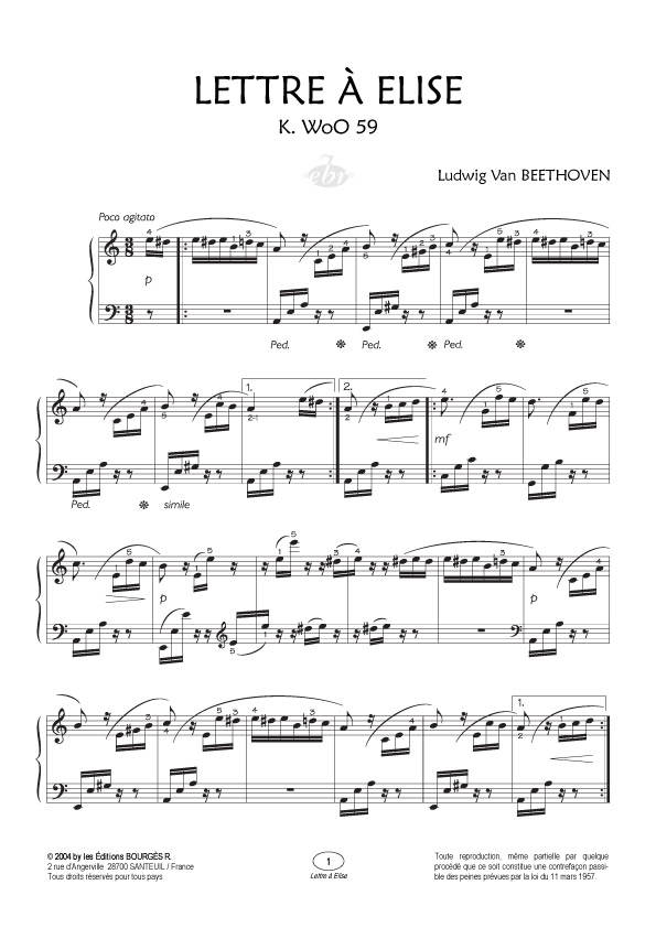 L’oeuvre fut composée, selon toute vraisemblance, en 1810 et jointe à un cahier d’Albumblätter comportant d’autres pièces. Elle ne fut éditée qu’un 1867, soit bien après la mort du compositeur. Son titre, Pour Elise, indique une sorte d’offrande musicale à une certaine Elise, mais en réalité, il résulterait d’une méprise de l’éditeur Ludwig Nohl. L’autographe, aujourd’hui perdu, aurait porté, non pas ce titre, mais celui de Pour Thérèse. L’oeuvre aurait donc été destinée à la jeune Thérèse, fille du docteur Malfatti que Beethoven avait espéré épouser en 1810. Quoiqu’il en soit de ces détails biographiques, cette courte pièce au ton élégiaque, pleine de charmes, conservera pour toujours sa place dans le panthéon des apprentis pianistes