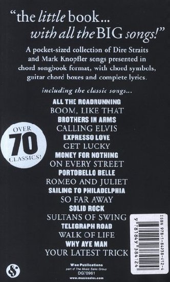 Descriptif : Livre de poche regroupant les partitions pour voix (paroles) et guitare (diagrammes d'accords) de plus de 70 chansons de Dire Straits et Mark Knopfler.