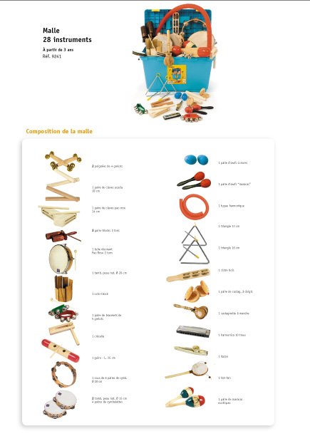 Descriptif : Cette malle est conçue pour respecter un certain équilibre entre les différentes sonorités et est spécialement adaptée à une classe entière. ' ' Elle permet une grande variété de sons pour une pratique collective. Voir la composition de la malle ci-dessous.' ' N.B. Tous ces instruments sont disponibles séparément. ' ' L. 50 cm' P. 28 cm' H. 33 cm